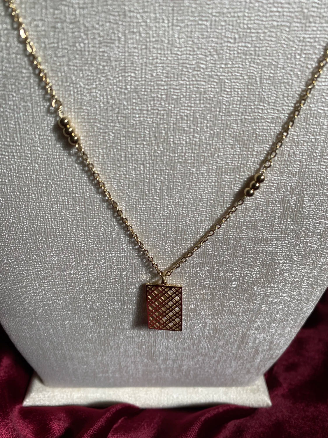 Fabriqué en acier inoxydable 316L doré, il résiste à l’eau, à la transpiration et ne ternit pas, garantissant une brillance durable. Son design raffiné associe médaillons floraux ajourés et un pendentif rectangulaire délicatement travaillé, offrant une allure chic et intemporelle.
