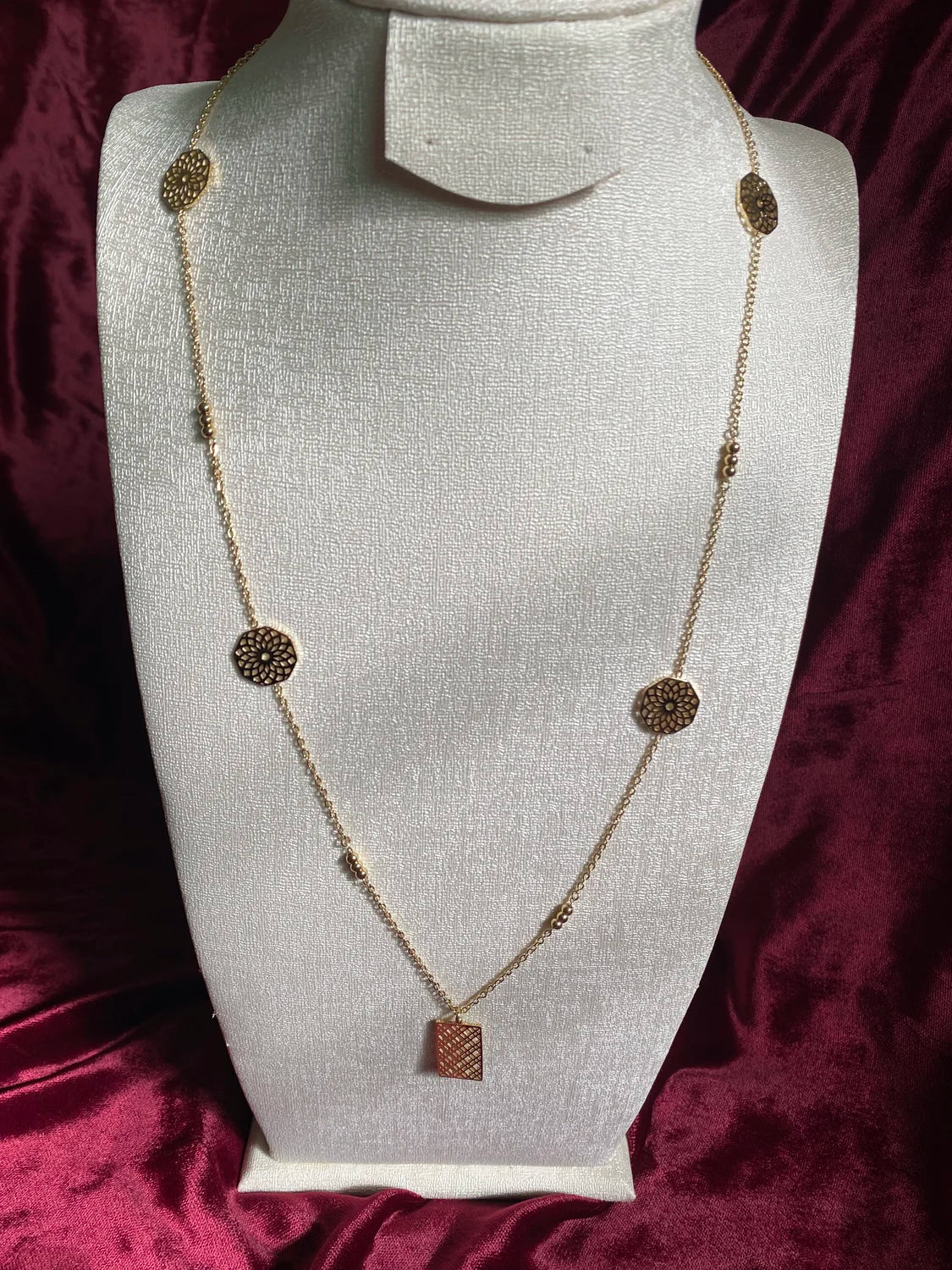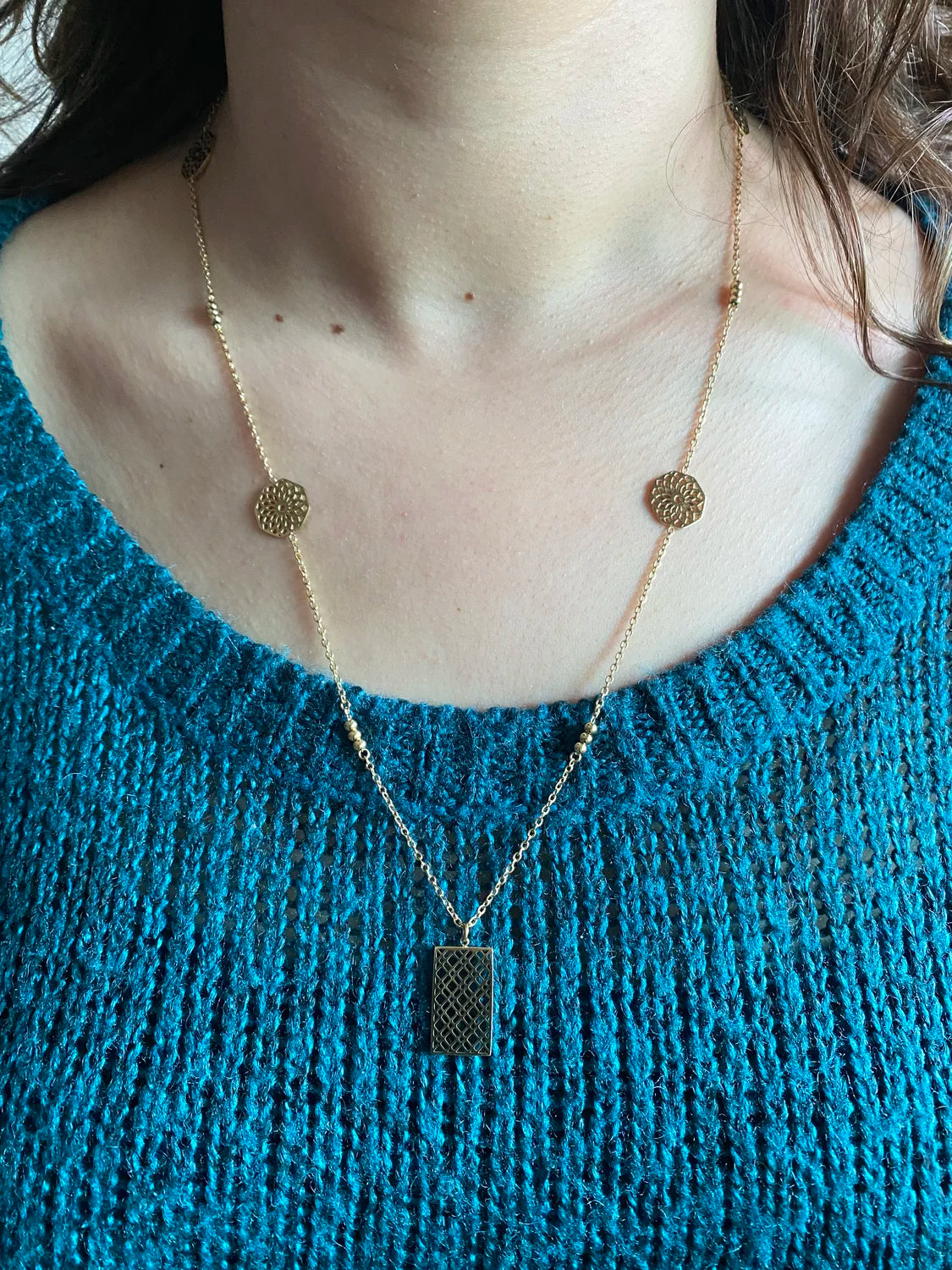 - Design : Médaillons floraux + pendentif rectangulaire ajouré