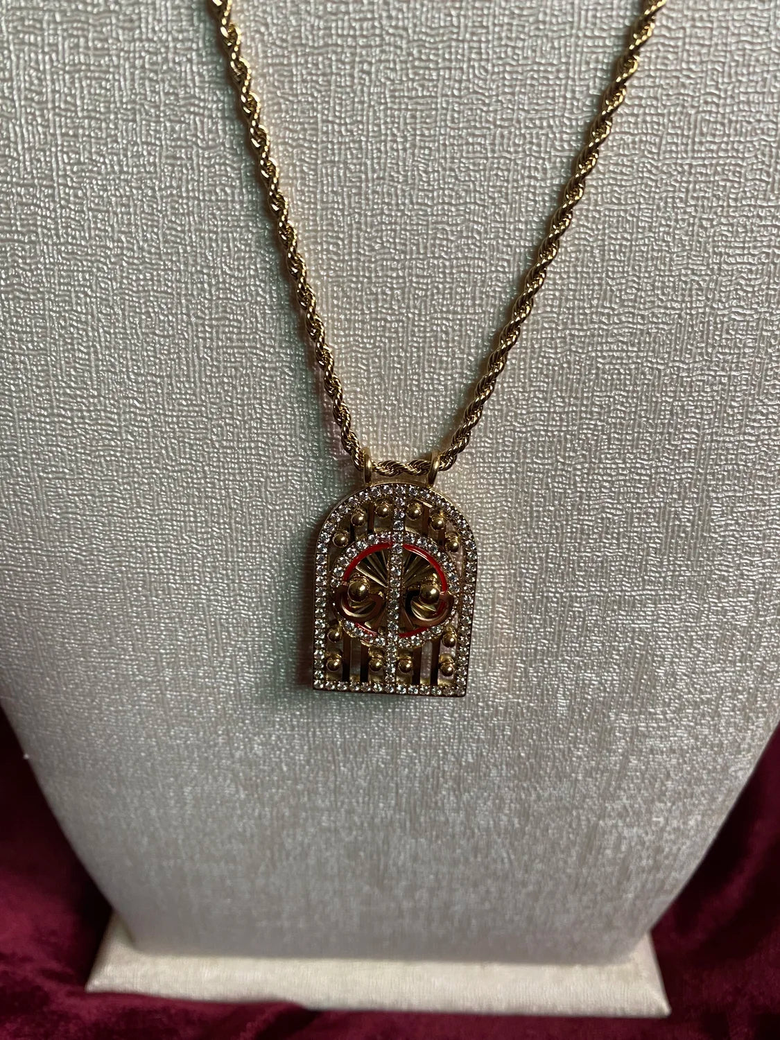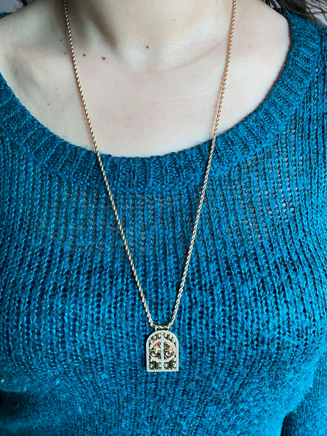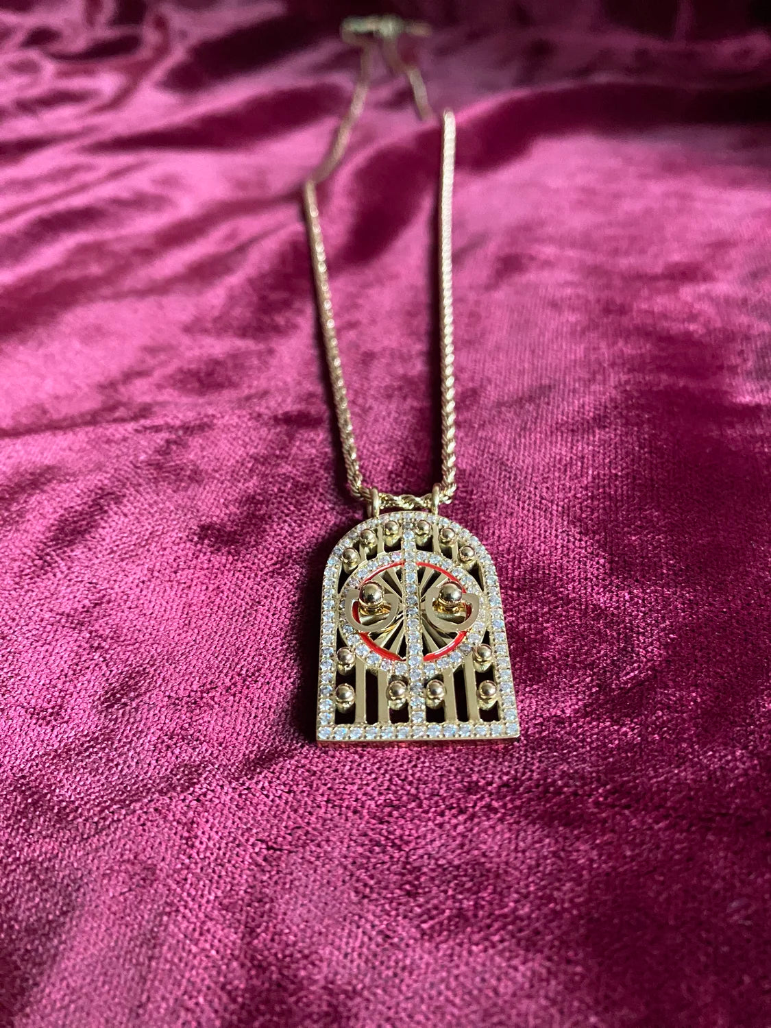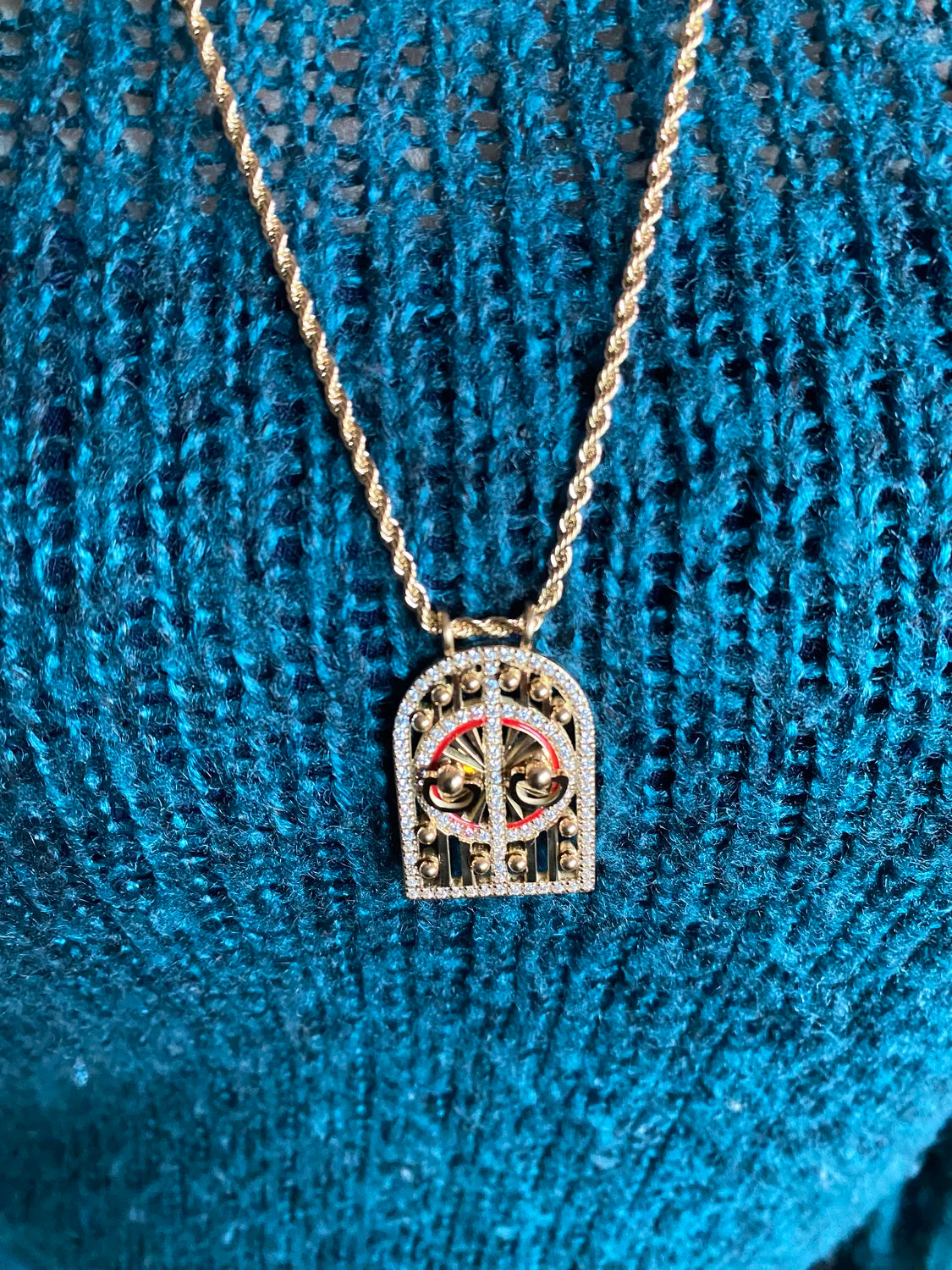 - Design : Pendentif porte arquée orné de pierres et détails colorés